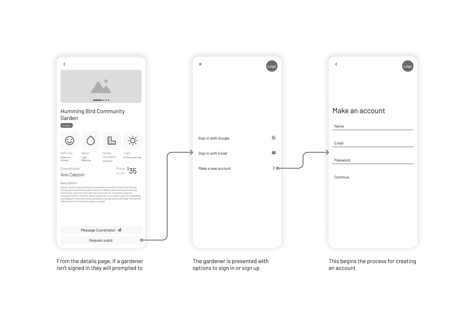 Our concept for un-authenticated users, as requested by the client, left the app open to explore, but required a sign-in/sign-up when requesting a garden plot