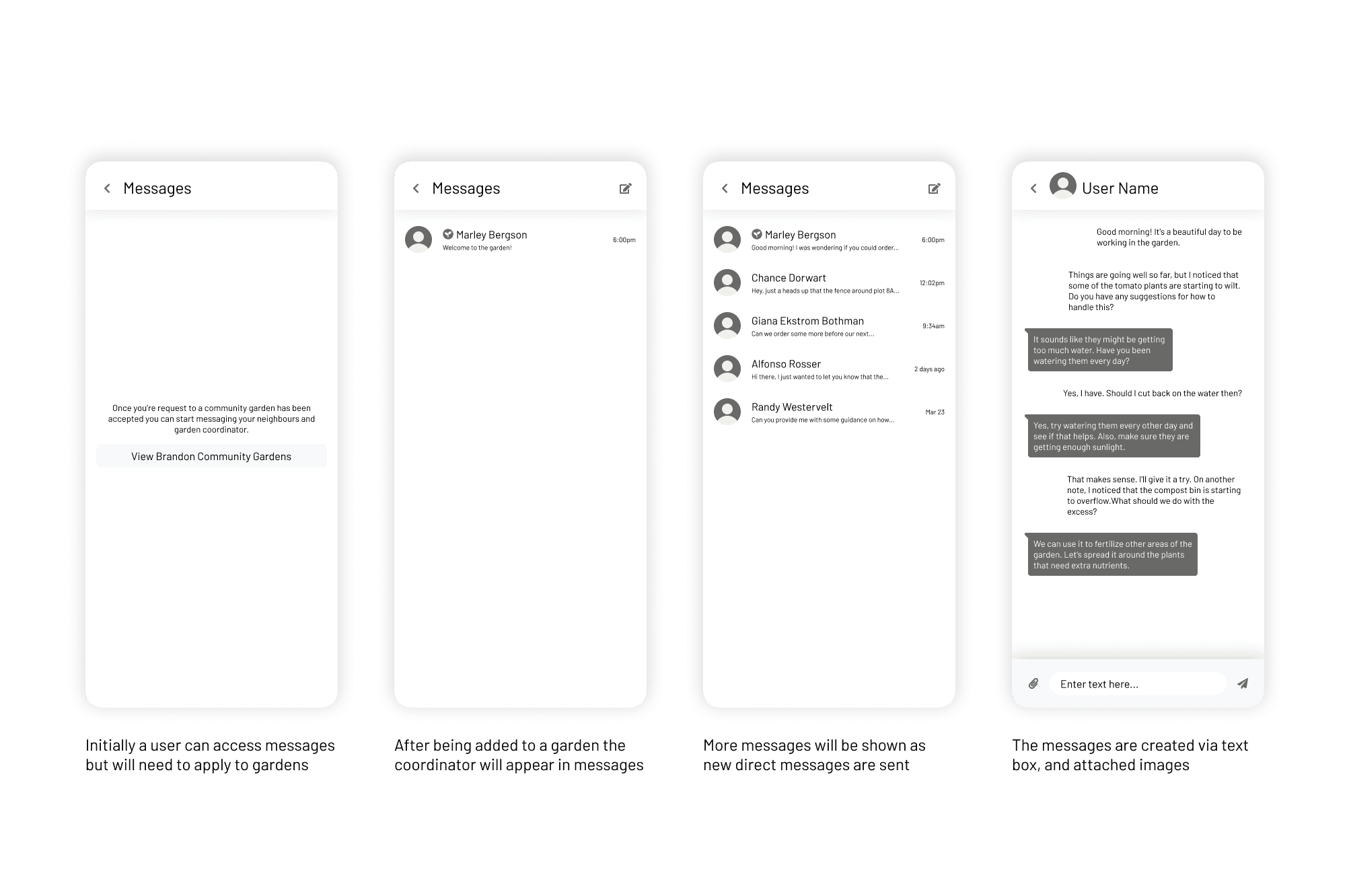 With communication being a key aspect of the experience messaging garden coordinators and other gardeners it was essential to provide group and direct messages.