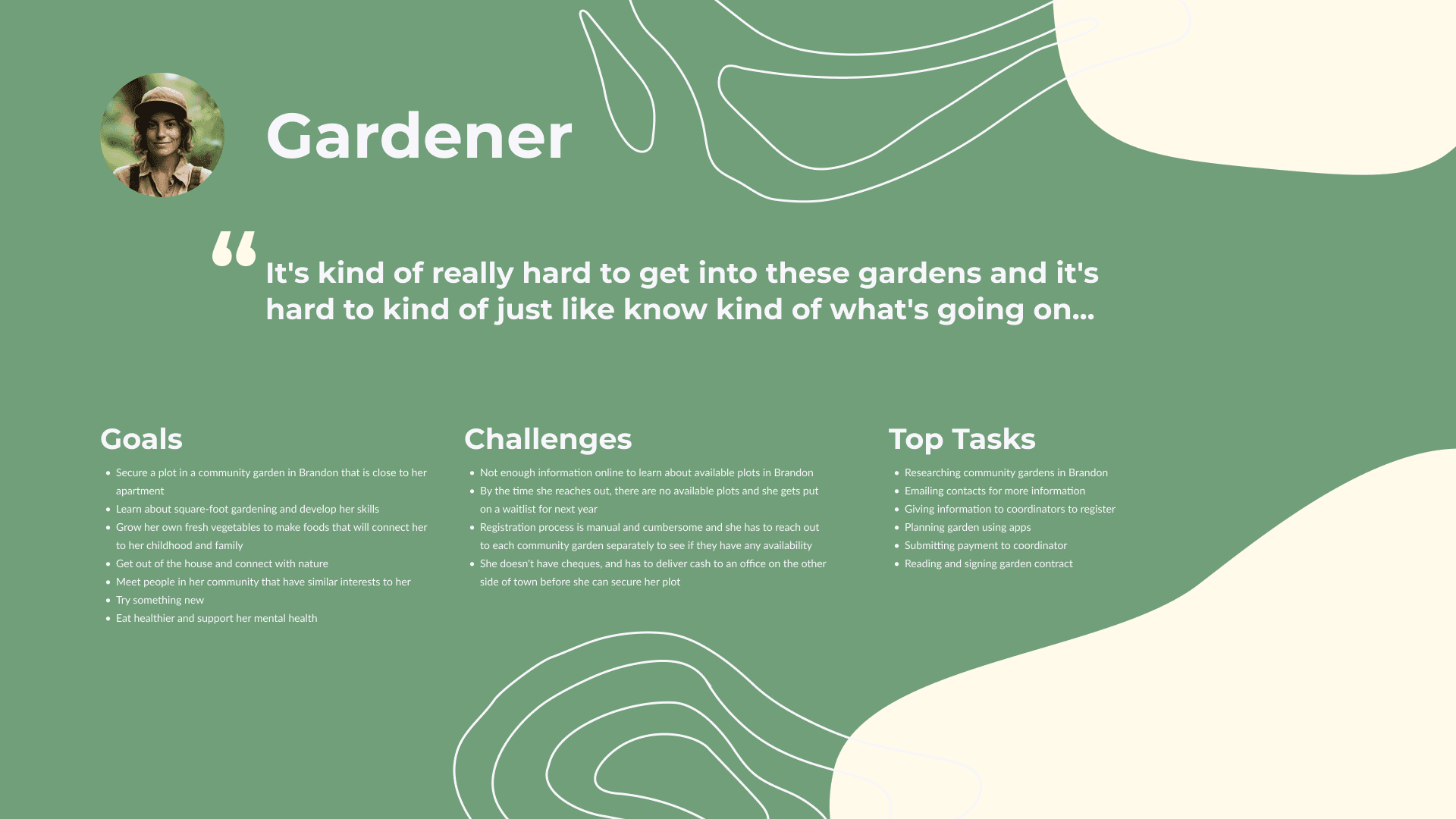 As a part of the YorkU UX certificate, a group of students and I were paired with a client. The client was a member of the Brandon Food Council and advocated for a new product to help with the community gardening services in the city of Brandon, Manitoba.