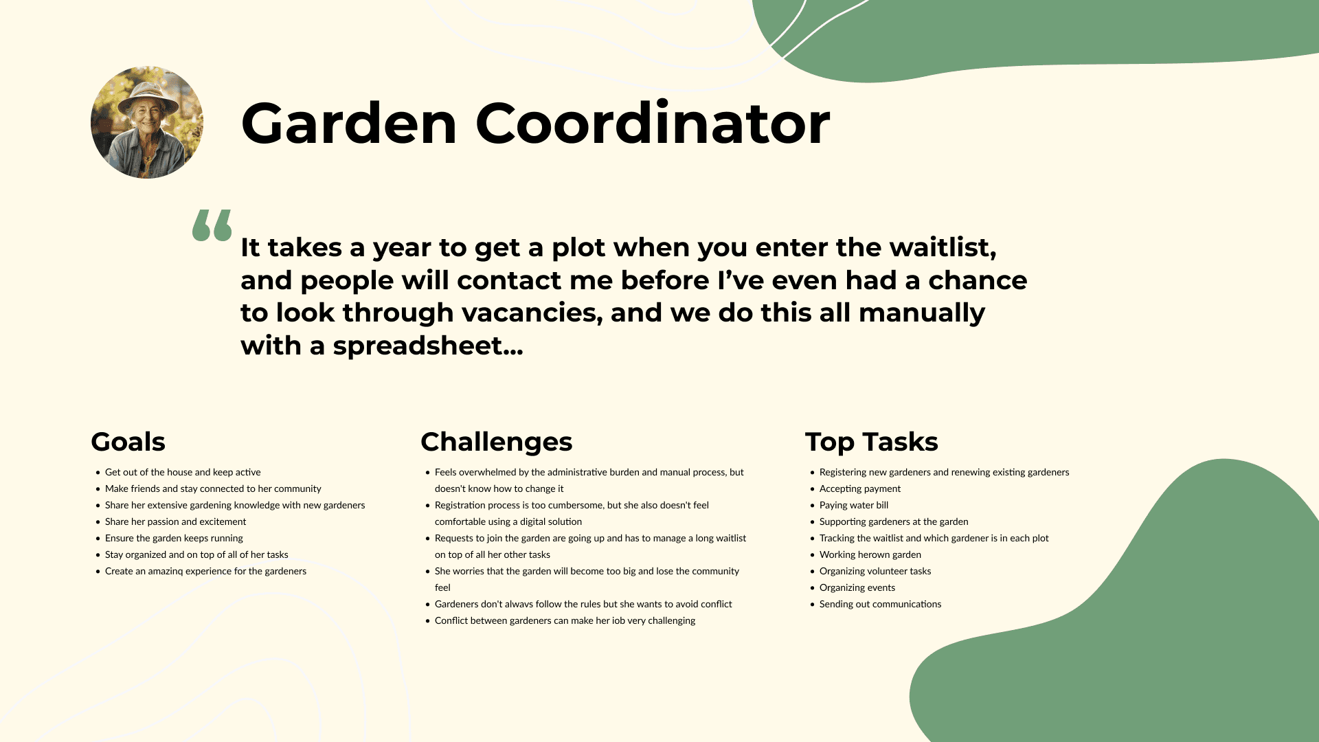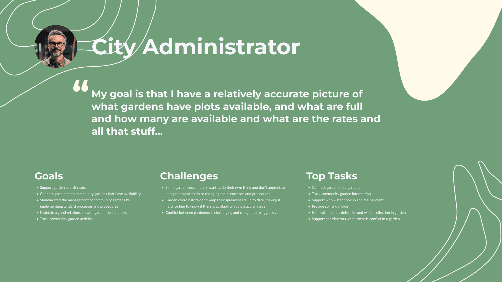 The team identified three key user groups we anticipate will experience an impact from the development of the Brandon Connect app, aimed at connecting gardeners with community gardens in Brandon, Manitoba.